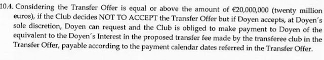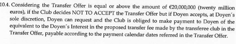 Uma das condições que o FC Porto e a Doyen fizeram no contrato rubricado em 2014 foi que tanto o clube como a Doyen,consideravam o valor de 20 Milhões de euros como um valor de mercado aceitável e de transferência razoável. Mas a melhor parte está quando a Doyen se aceitar um valor superior aos 20 milhões,o FC Porto é "obrigado a aceitar a oferta"ou então a compensar a Doyen conforme a cláusula 10.4. Ora vamos lá a essa cláusula...